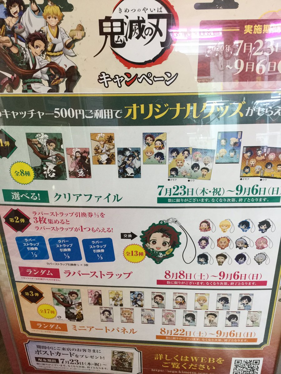セガ ワールド 宇品 no twitter 鬼滅の刃キャンペーン開催中 クリアファイル在庫状況 竈門炭治郎 在庫あり 竈門禰豆子 残り9枚 我妻善逸 在庫あり 嘴平 伊之助 在庫あり 夏祭りa 18枚 夏祭りb 8枚 たい焼きa 10枚 たい焼きb 2枚