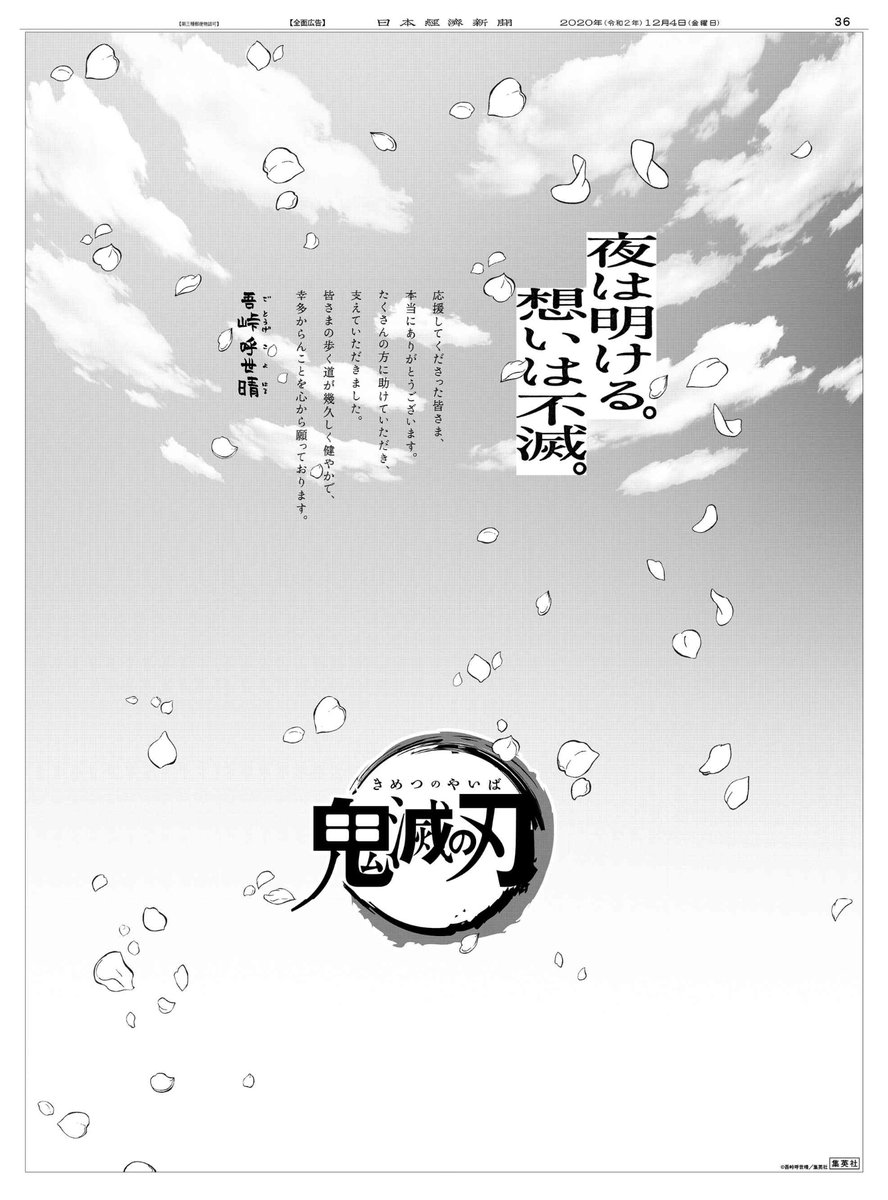 たかℹ 3 19乾燥注意 寒暖気温差注意 花粉飛散注意 on twitter 鬼滅の刃 2020年12月04日朝刊 広告 日本経済 日経 新聞 煉獄杏寿郎 甘露寺蜜璃 伊黒小芭内 夜は明ける 想いは不滅 鬼滅の刃 一億冊突破