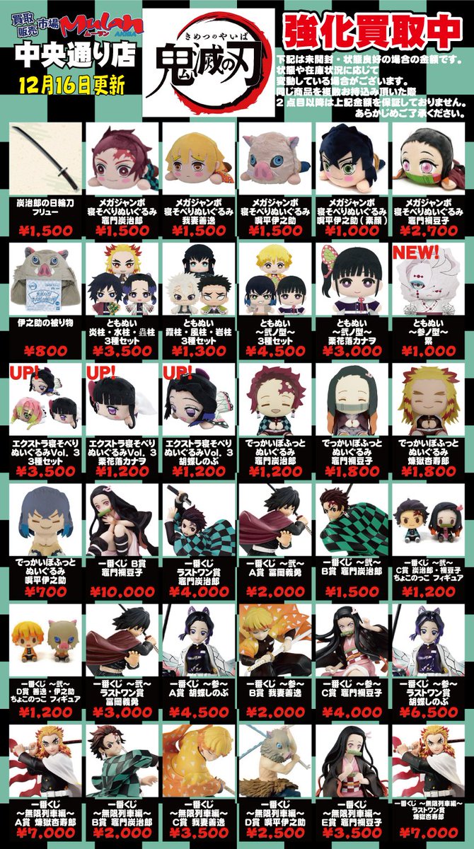 エックス秋葉原本店 on twitter 1 20更新 プライズ強化買取表 アキバのエックス本店では 鬼滅の刃 シリーズのフィギュアを 買い取り中 本店限定の提示価格となりますのでご注意下さい 価格は変動する場合がございます 宅配査定ではプライズの買取は