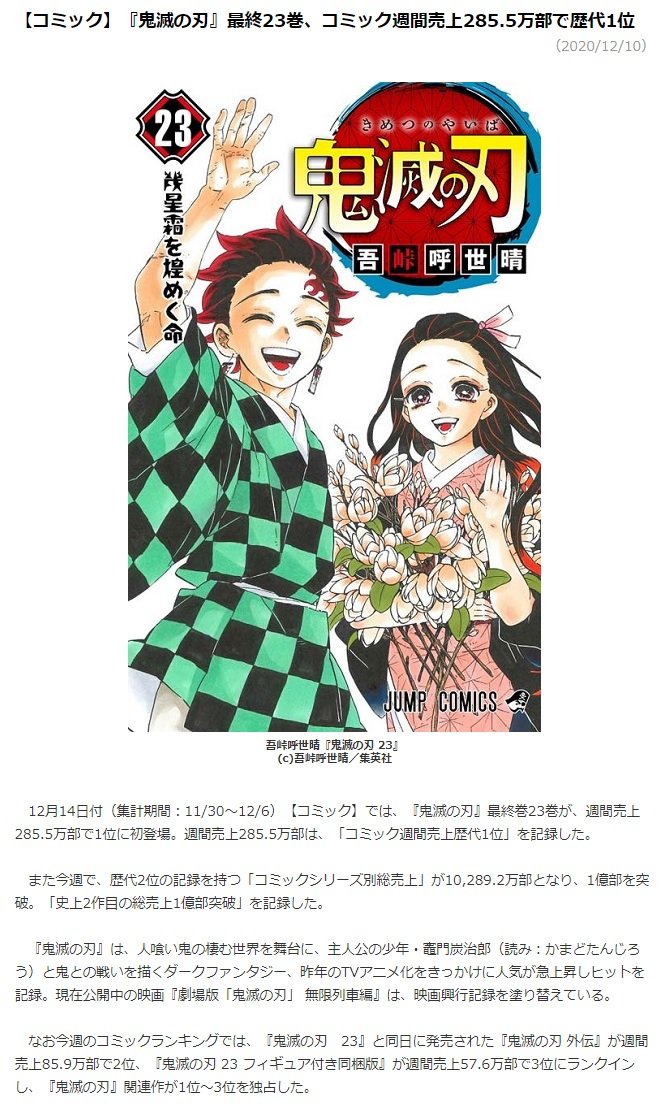 鬼滅の刃 10月2日発売22巻で1億部突破 週刊少年ジャンプ 8作目の快挙 2020年9月24日 アニメ ゲーム ニュース クランクイン