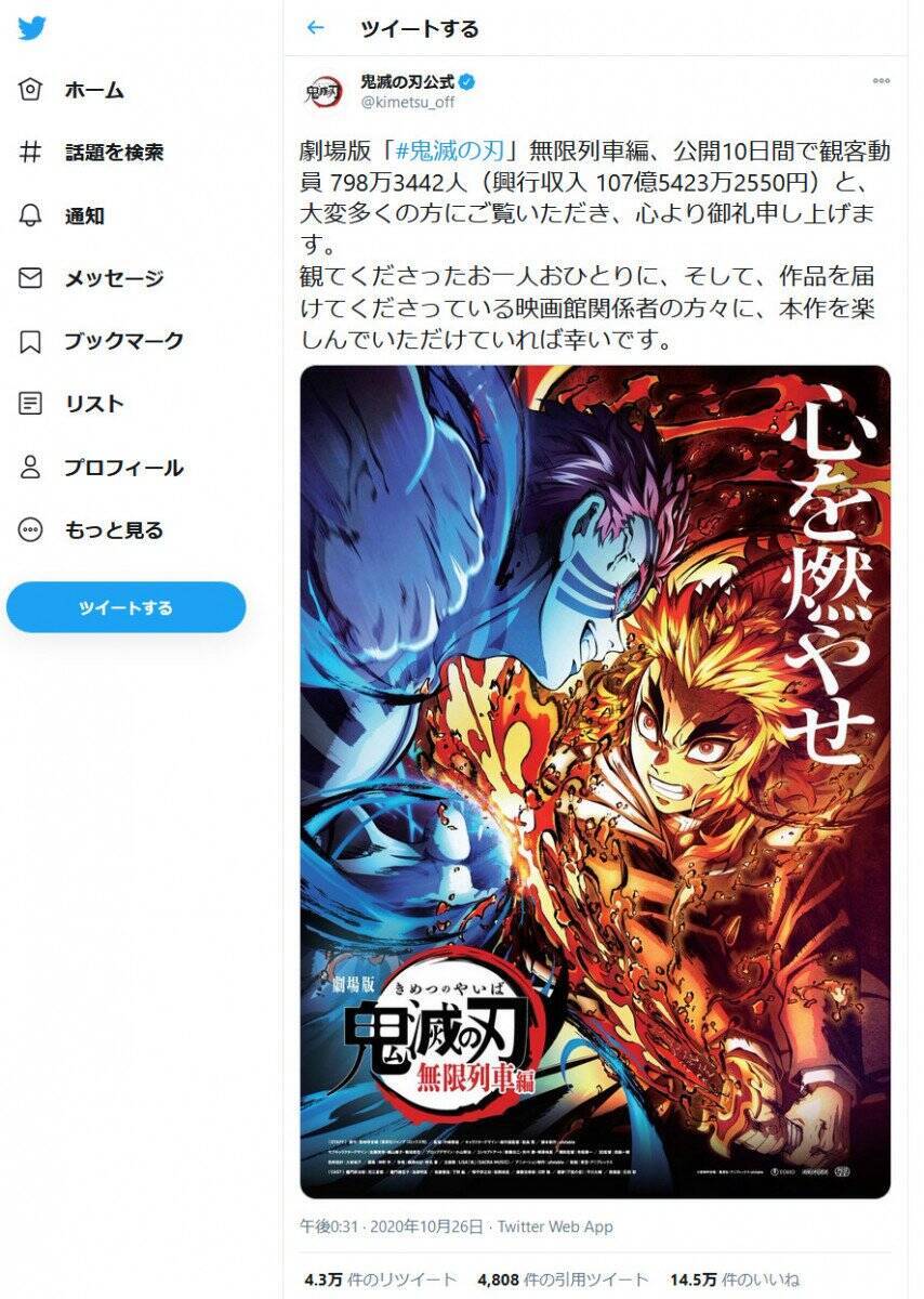映画 鬼滅の刃 興行収入1位に 324億円で 千と千尋 抜く 産経ニュース