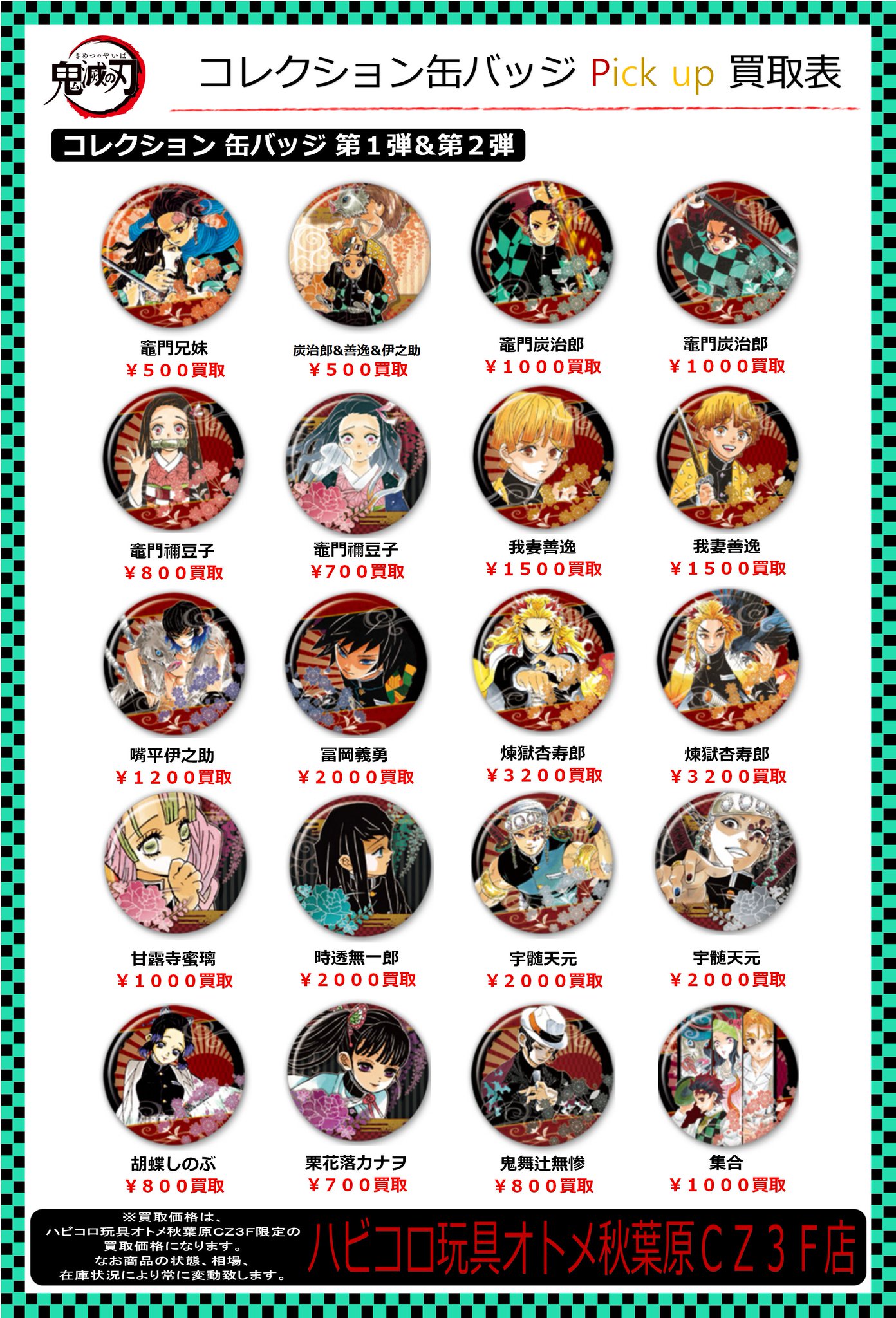 k books キャラ館 ジャンプ on twitter 鬼滅の刃 コレクション缶バッジ 煉獄 杏寿郎 1200円買取 富岡 義勇 800円買取 竈門 炭治郎 600円買取 ピンの絵柄のみ 買取価格上がりました ドシドシお持ち込みお待ちしています kbooks 池袋 高価買取