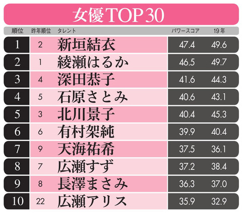 芸能 タレントパワーランキング2020 女優編 新垣結衣 女優1位返り咲き 綾瀬はるかとの2強続く さいたまとめ