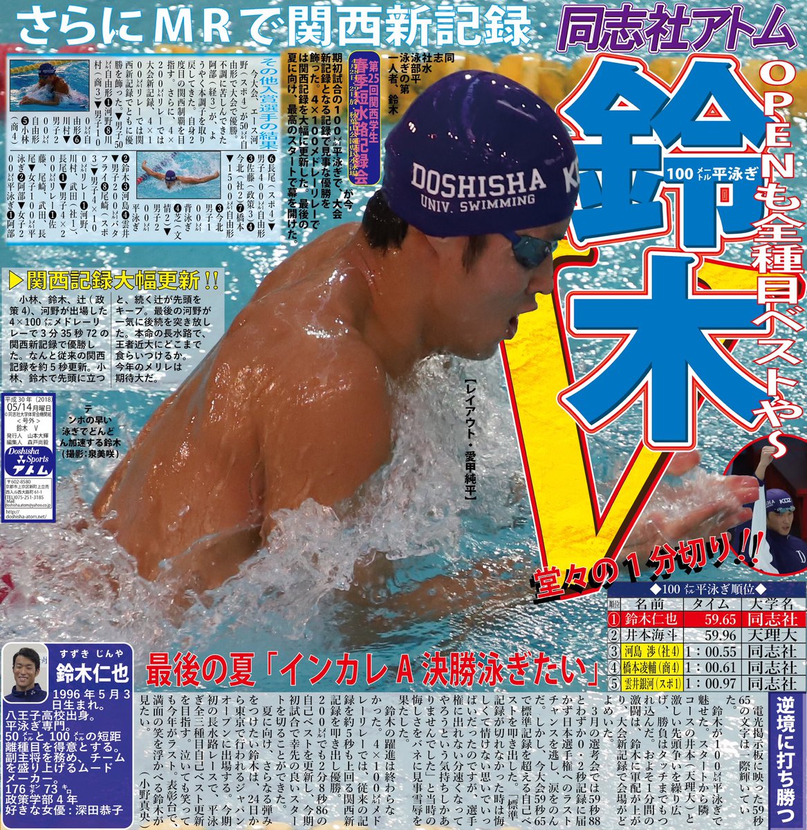同志社スポーツアトム編集局 pa twitter 水泳部 第25回関西学生春季短水路記録会 4月28 29日 秋葉山公園県民水泳場 和歌山県 鈴木 v いよいよ開幕した2018シーズン 鈴木が平泳ぎ両種目で自己ベストを更新 夏に向け幸先の良いスタートを切った 24日から